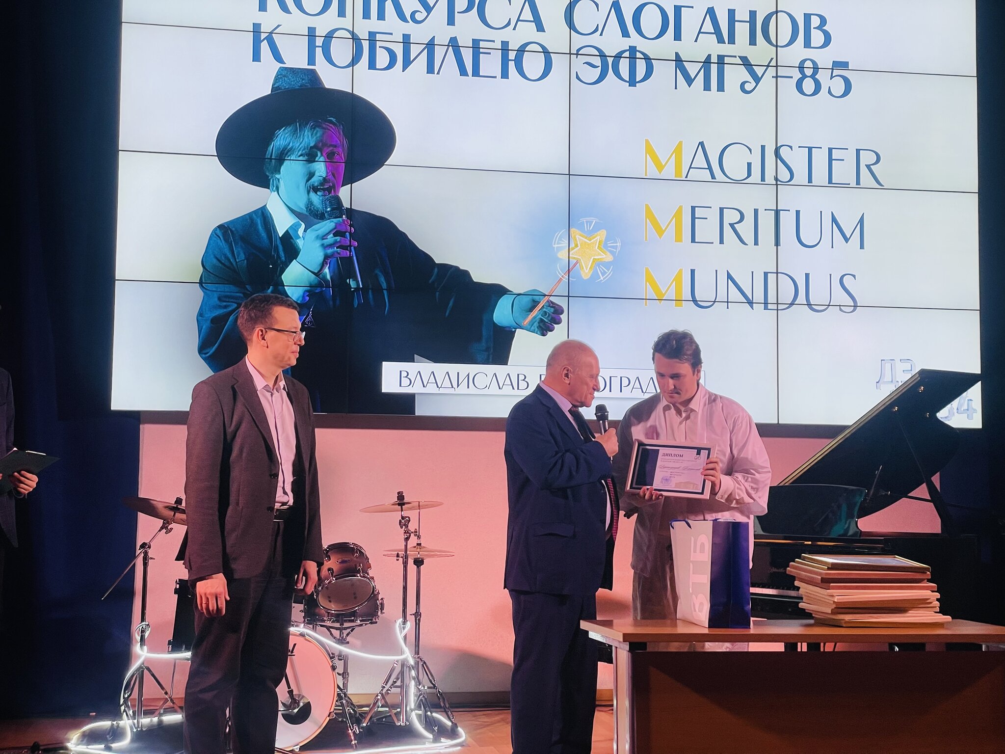 В ходе вечера были также награждены активные студенты, делающие внеучебную жизнь интереснее и увлекательнее (призы предоставил Газпромбанк), и Д.Н.Чебурашкин-Антипин, сотрудник, благодаря которому, в частности, у нас есть записи всех концертов Музчаса, банк видео лекций преподавателей и т.п. (подарок был предоставлен банком ВТБ).