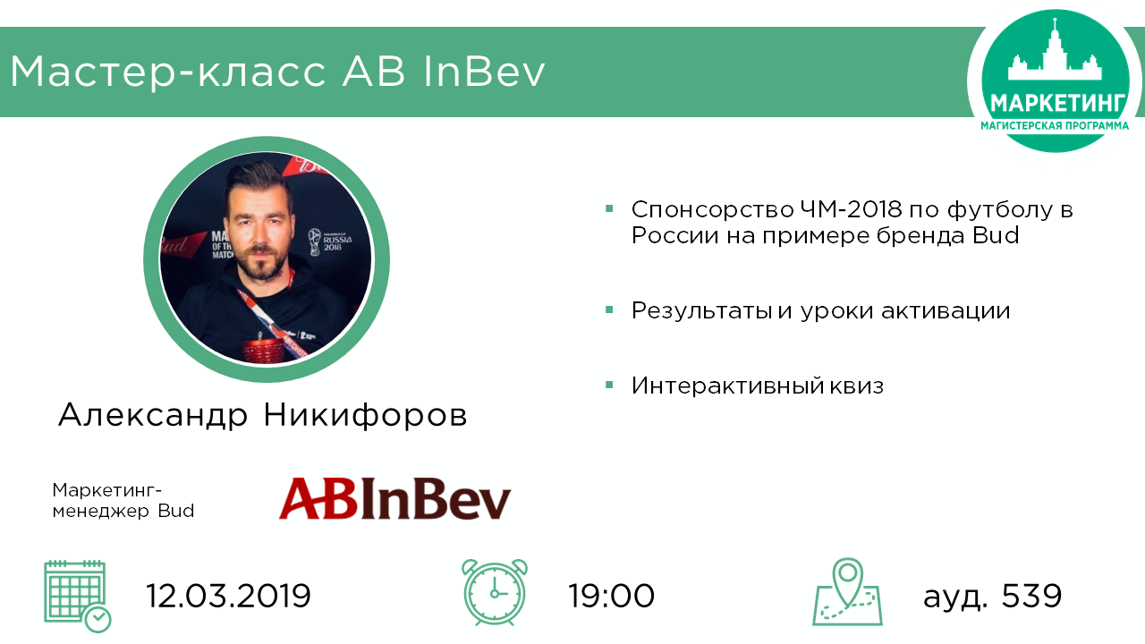 12 марта 2019 года в рамках научно-практического семинара магистерской программы «Маркетинг» состоится мастер-класс «Спонсорство ЧМ-2018 по футболу на примере бренда Bud».